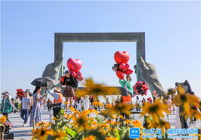 9月16日,威海地標性雕塑“大相框”成為市民、游客爭相游覽的網紅打卡點,海浪般藍白色調交織的小廣場上游客如織,各色各樣的氣球紛飛,氣氛熱鬧而歡快。不遠處的海岸沿線,有人漫步觀海聽浪,有人騎行追風,享受溫柔的海風和秋的氣息。